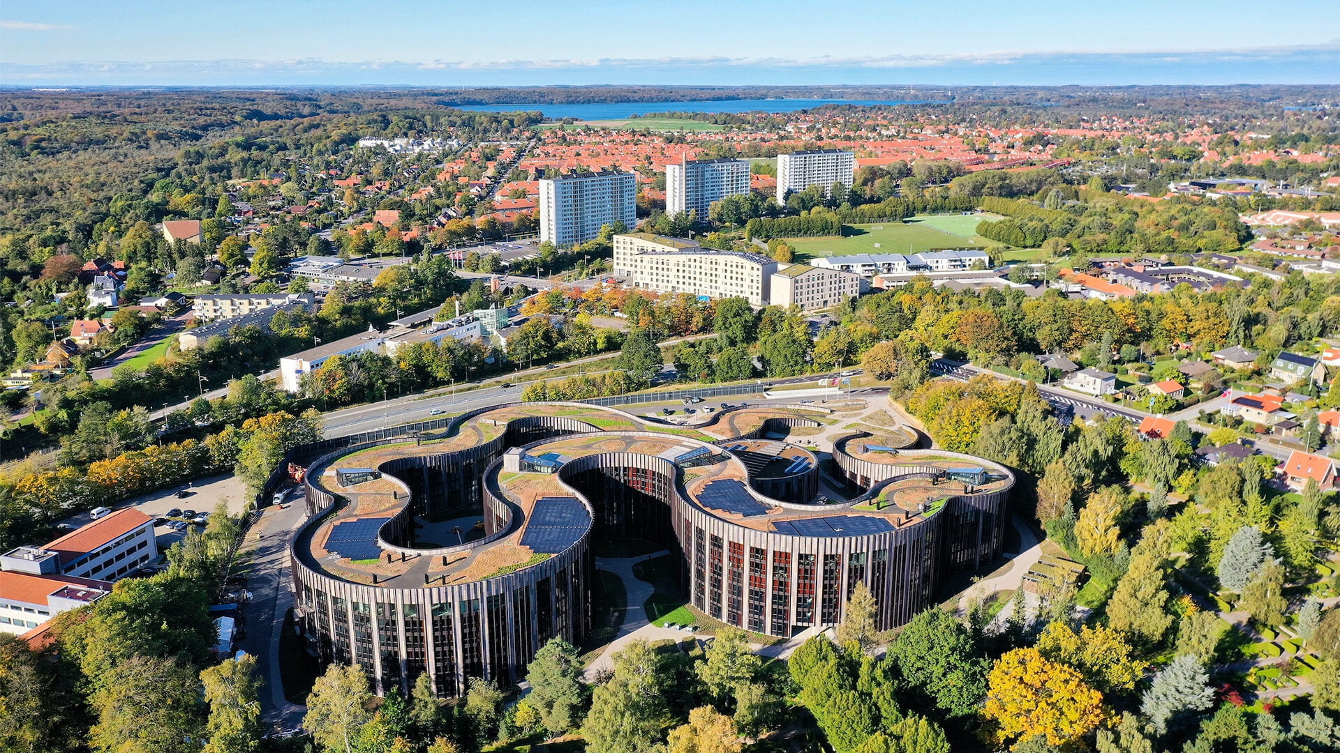 I BaseCamp Lyngby er det innovative boligkoncept integreret med en omgivende park, hvor der er skabt et imødekommende og rummeligt miljø for både bygningens beboere og besøgende fra hele byen. Foto: DronePixels