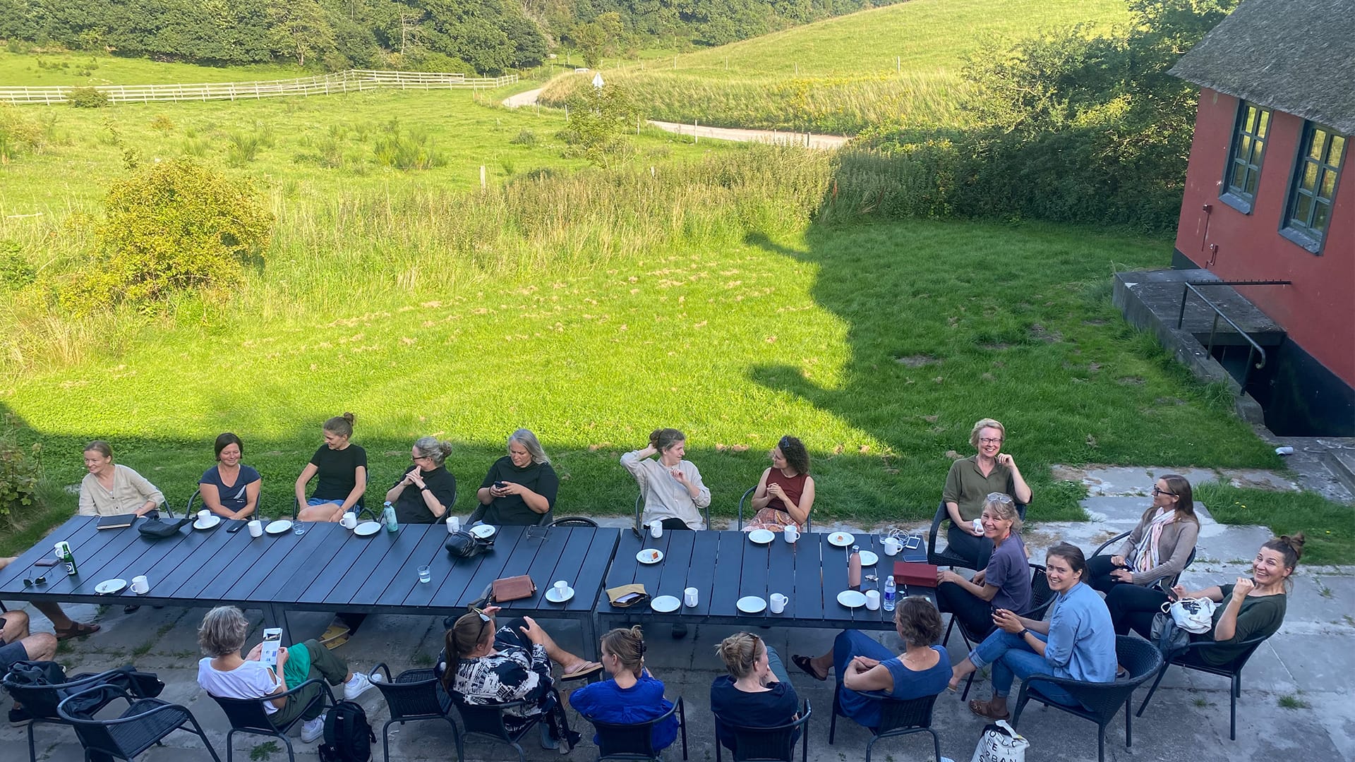 Hyggeligt samvær i pauserne nydes blandt andet med kaffe og kage ved de gamle stråtækte bygninger, som også udgør logi under kurset. Foto: Maria Henriette Sørensen