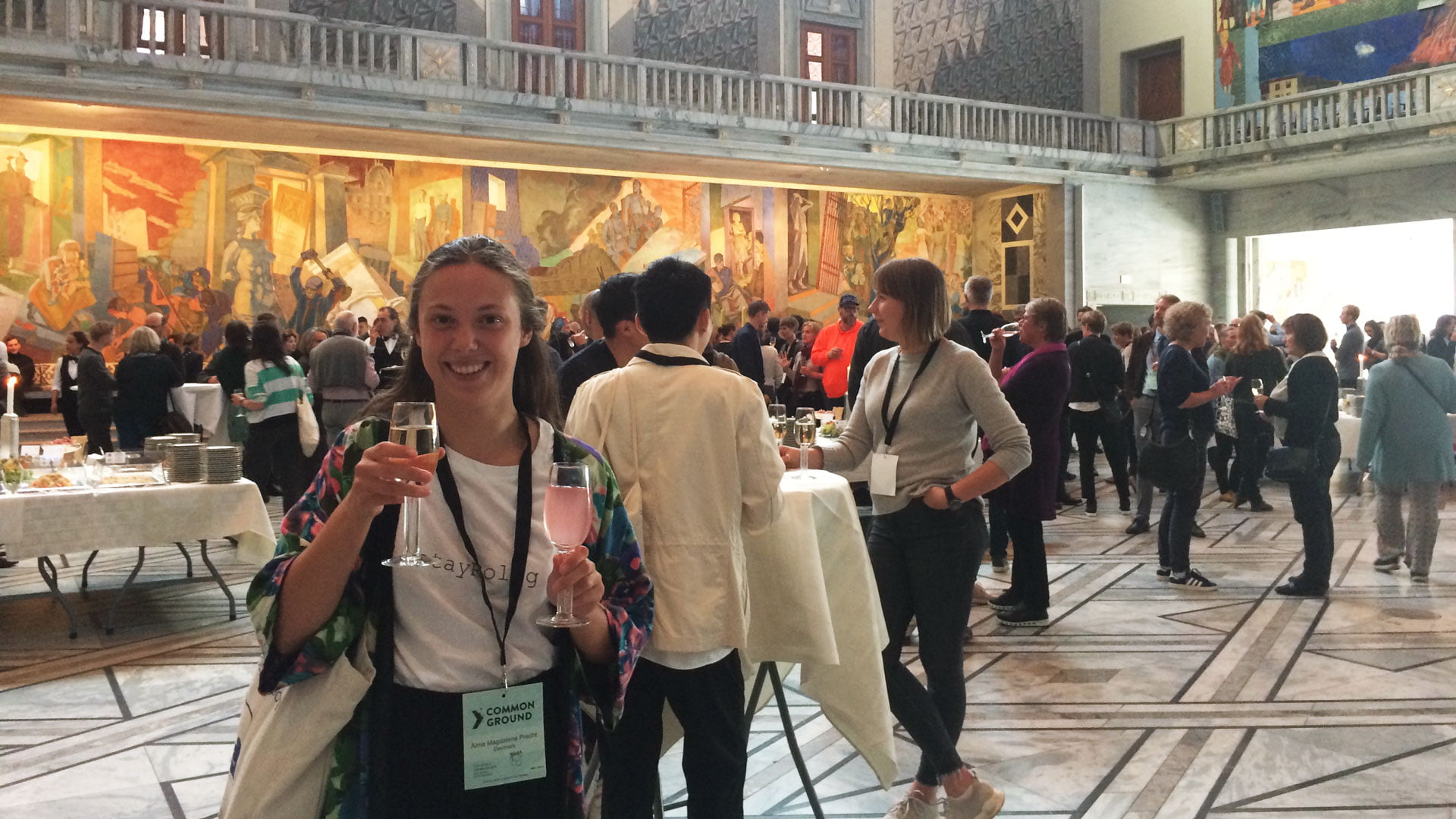 Foto: IFLA World Congress afslutningsceremoni på Oslos smukke rådhus. Min rejsefælle, landskabsarkitektstuderende Alma Magdalene Precht, har sørger for forsyninger. Fotograf: Anna Bové.