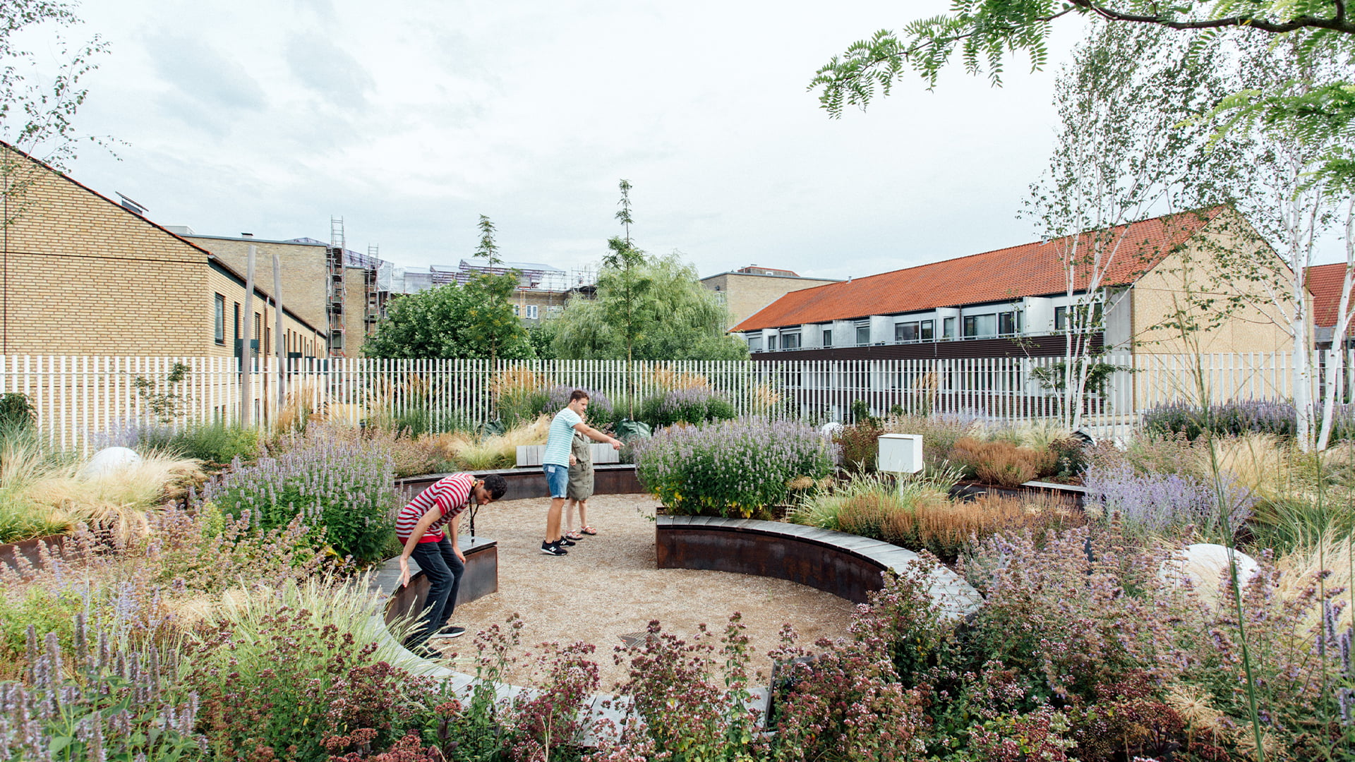 ”Brugerinddragelsesprocessen resulterede i tre overordnede temaer, der efterfølgende dannede grundlag for inddelingen af haven i tre forskellige zoner. Grøntsagshaven har bistader, frugt og bær. Blomsterhaven fungerer som en oase for brugerne med intime opholdslommer med blomstrende stauder, insekter og fugle, mens bålhaven udgør et trygt, fælles samlingspunkt. De tre haver varierer i størrelse og stimulerer forskellige sanser til glæde for brugernes trivsel,” fortæller Sune Oslev.