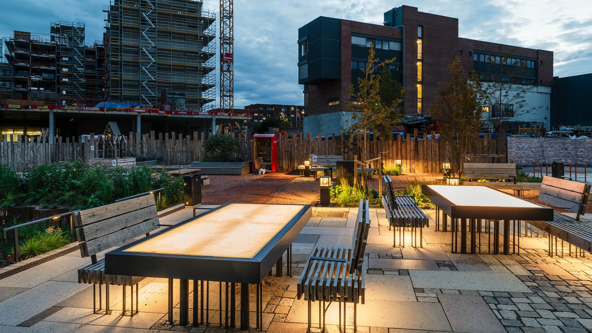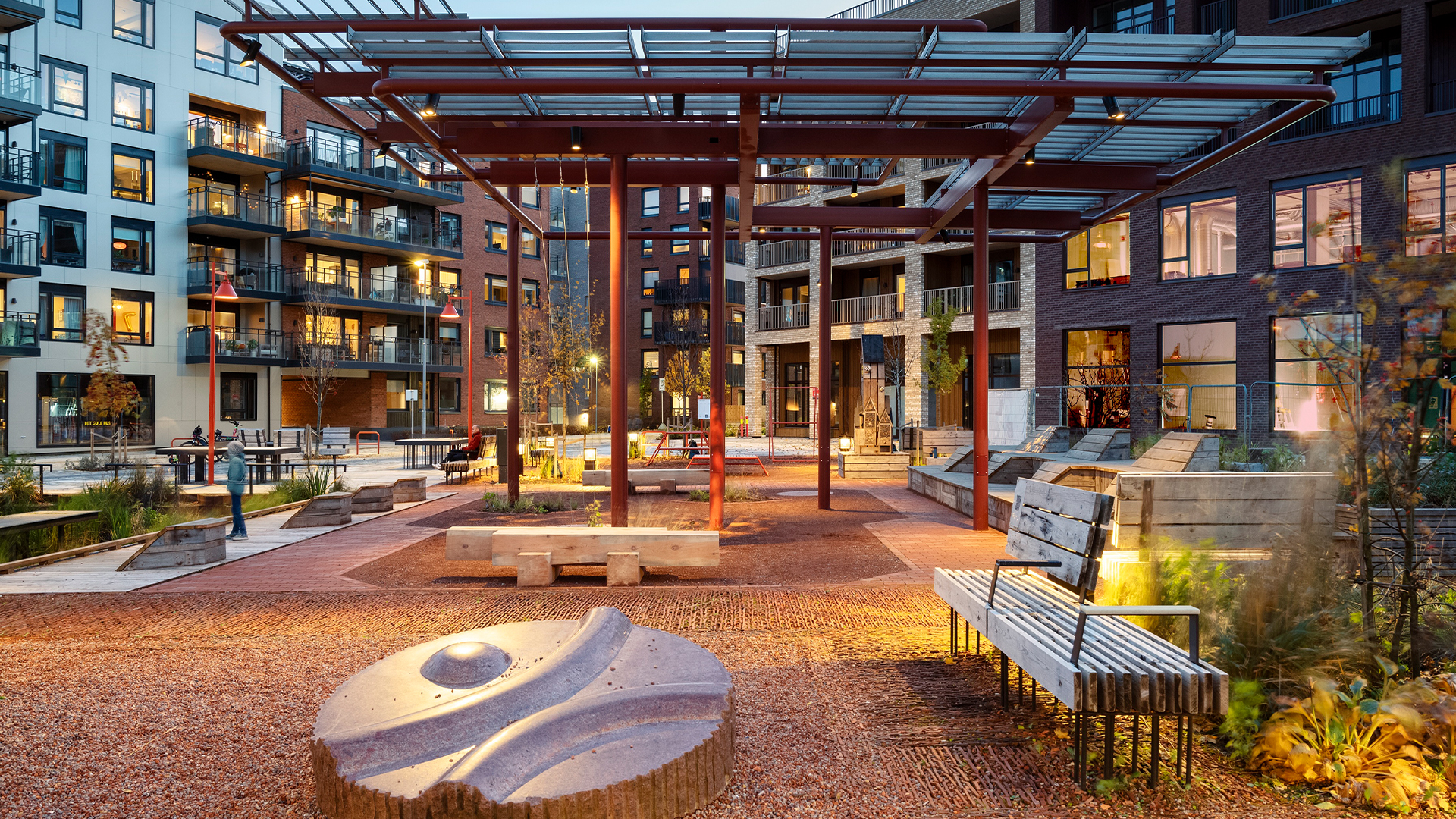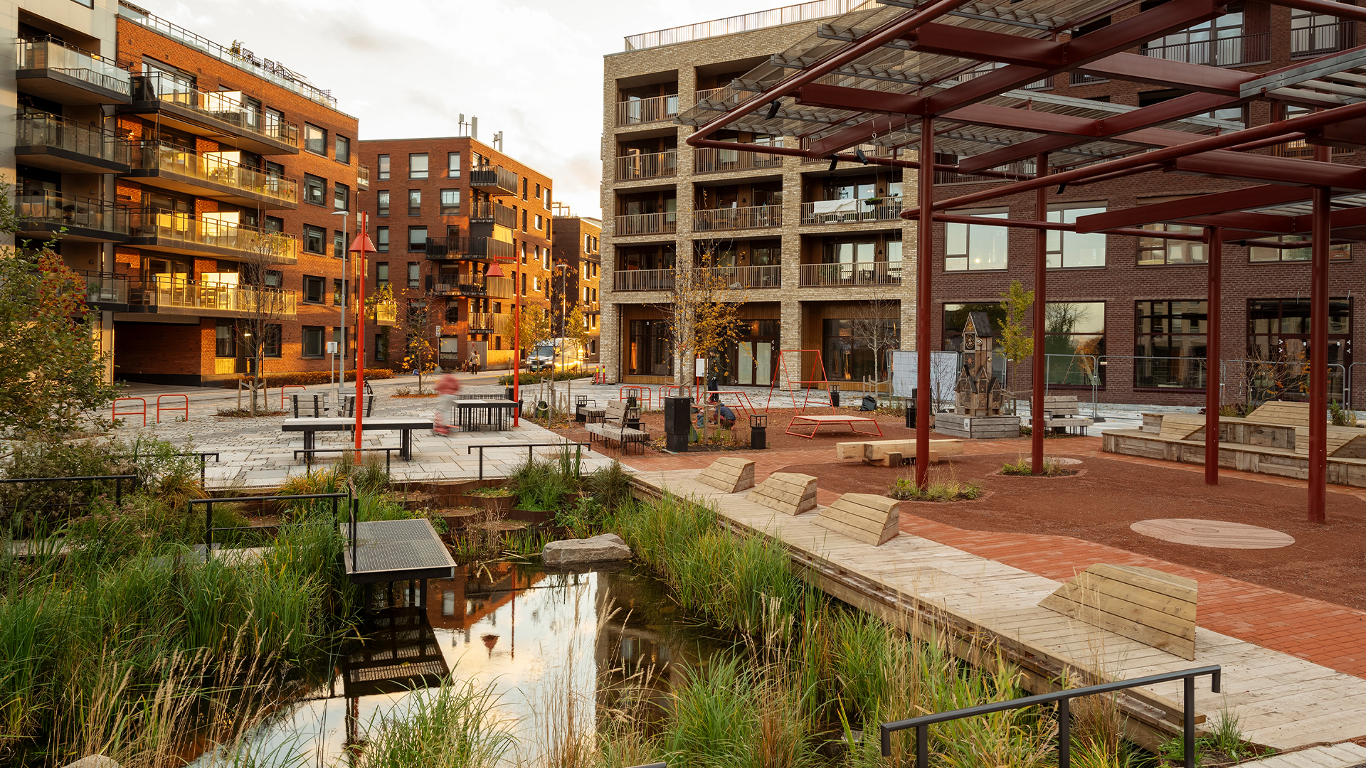 Juryen er blevet overbevist og imponeret over projektet på Vollebekk Torg, som udforsker cirkularitet, miljøengagement og gør det til en mulighed og kvalitet i designet.