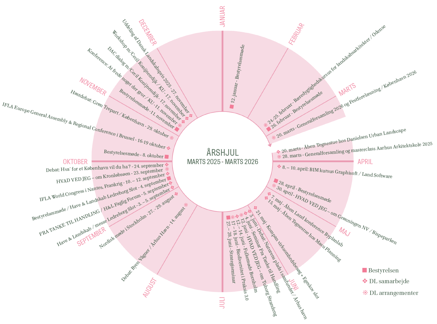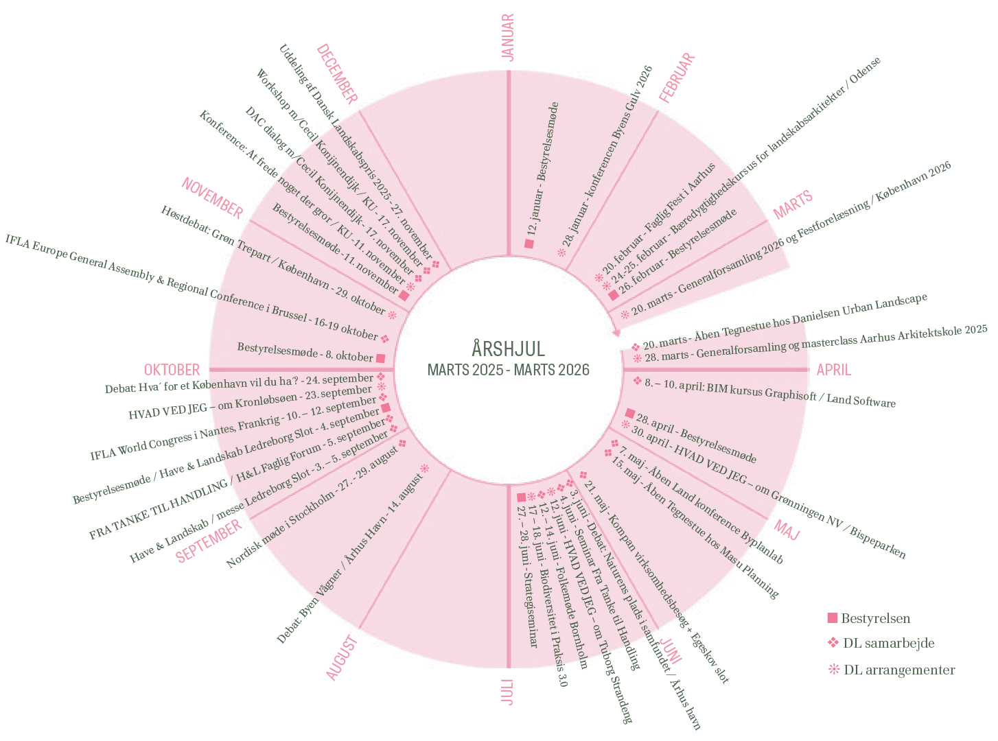 Danske Landskabsarkitekters kalender deles her med vores medlemmer i form af et overskueligt årshjul