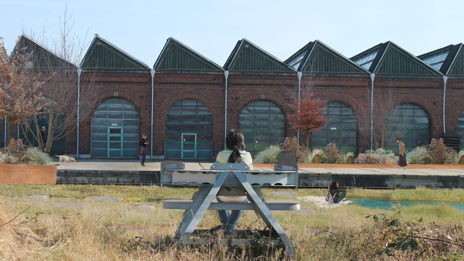 Store industrielle elementer bliver vedligeholdt og kontekstualiseret gennem nye funktioner og beplantning.