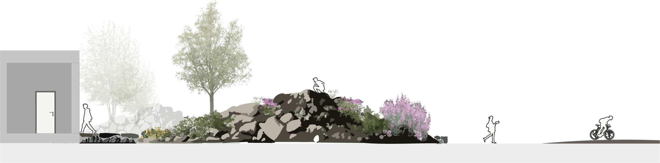 Store plantebede vil strategisk blive placeret på gågader, for at fremme de grønne korridorernes funktion. Hjemmehørende arter fundet i området vil plantes i disse kasser, omfanget af jernbaneskinnerne.